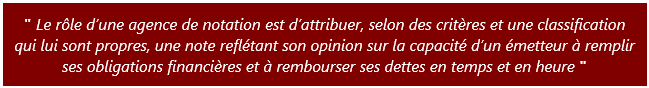 Le rôle d’une agence de notation est d’attribuer, selon des critères et une classification qui lui sont propres, une note reflétant son opinion sur la capacité d’un émetteur à remplir ses obligations financières et à rembourser ses dettes en temps et en heure. Cette note permet donc d’avoir une évaluation du risque de crédit d’un émetteur (Etat, entreprise, collectivité locale,…) et influe sur le niveau du taux d’intérêt auquel il peut emprunter. Plus la note est mauvaise, plus le taux d’intérêt est élevé.