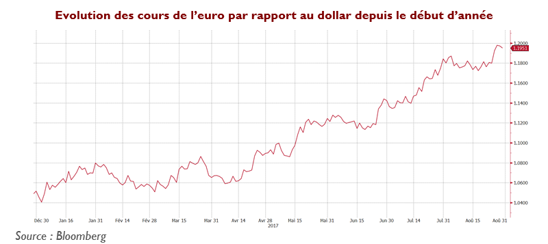 Cette amélioration des fondamentaux économiques pourrait permettre à la BCE d’entamer la normalisation de sa politique monétaire et de poursuivre dans un premier temps la réduction de son programme de rachat de dettes. En parallèle, les marchés doutent de la capacité de la Fed à augmenter ses taux au cours des prochains mois. Ces sentiments opposés sur les politiques monétaires des deux banques centrales contribuent à faire grimper l’euro par rapport au dollar, car les anticipations de différentiel de taux entrainent des flux de capitaux vers la zone euro. La réunion des banquiers centraux à Jackson Hole le 25 août n’a fait qu’accélérer cette tendance car Mario Draghi n’a montré aucune inquiétude sur la tendance de l’euro.